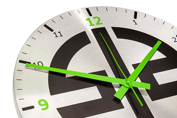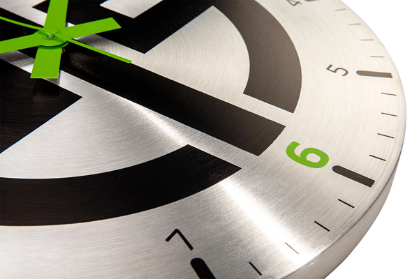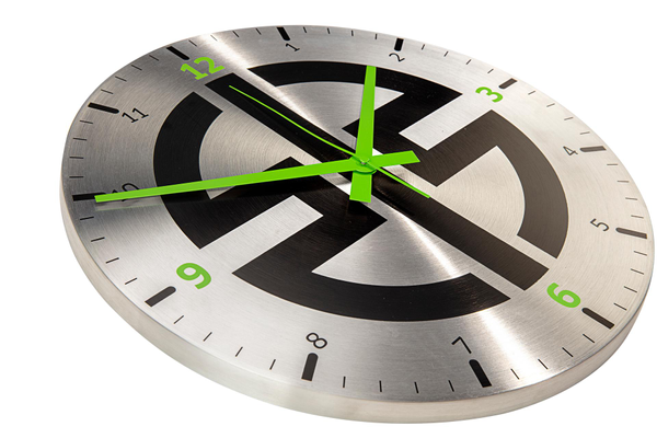 Wandklok in geborsteld aluminium met rivermark-logo. Diameter 40 cm. Soepele uurwerkmotor. Werkt op AA-batterij (niet inbegrepen).