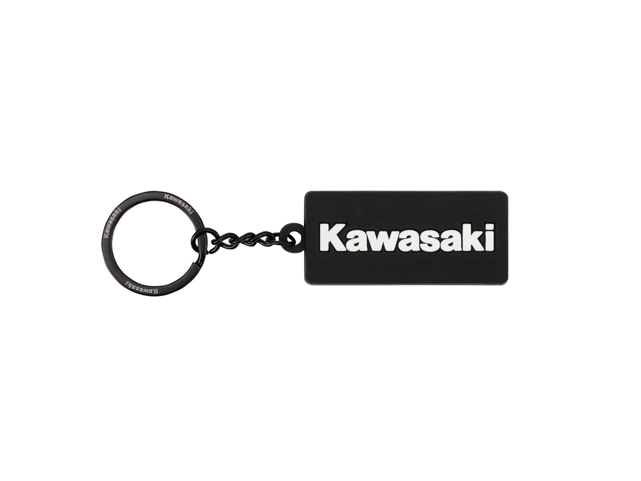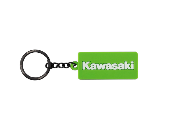 Dubbelzijdige zwart/groene sleutelhanger met ingelegd Kawasaki-logo. Afmetingen: 5,5 × 2,5 cm.