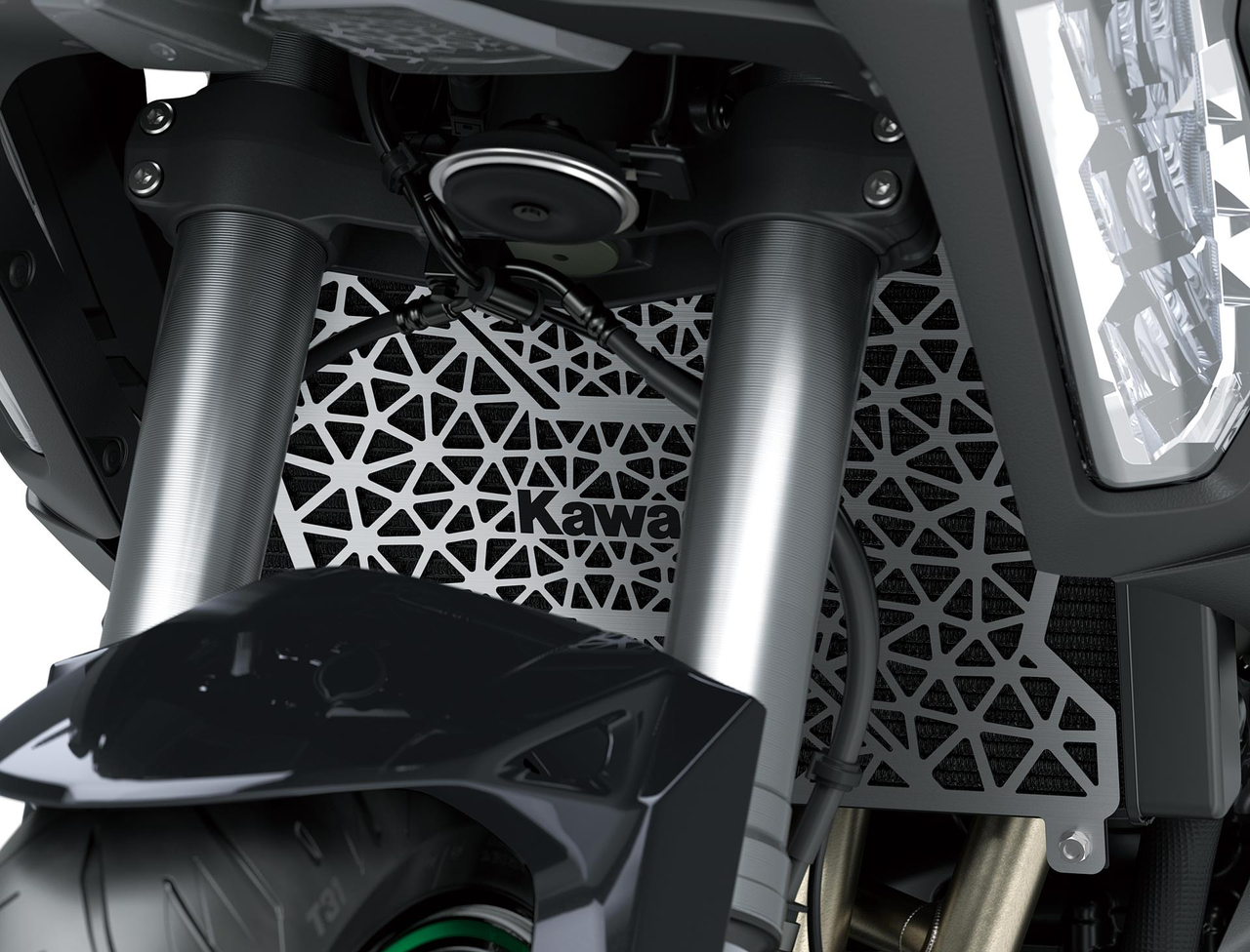 Metalen radiateurcover met laser-gesneden Kawasaki-logo. Biedt bescherming met minimale gewichtstoename en maximale luchtstroom.